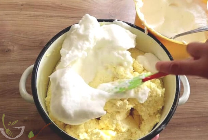 Окремо збити білки зі щіпкою солі . Додати збиті білки та крохмаль до сирної маси, акуратно все вимішати.