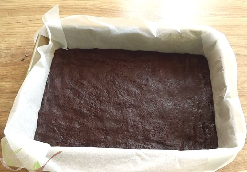 Спершу готуємо шоколадний шар. Змішати всі сухі інгредієнти , до них потерти масло, дати яйце і сметану і замісити тісто. Розподілити його по формі і в морозилку на 30хв.